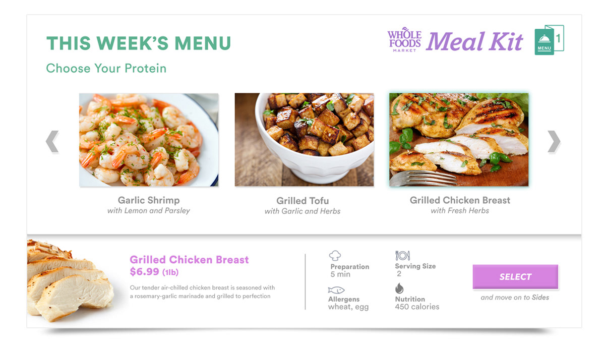 Overview | Within brand standards, design a UX/UI digital menu for a weekly flexible meal kit for Whole Foods Market stores that would cater to this type of venue.