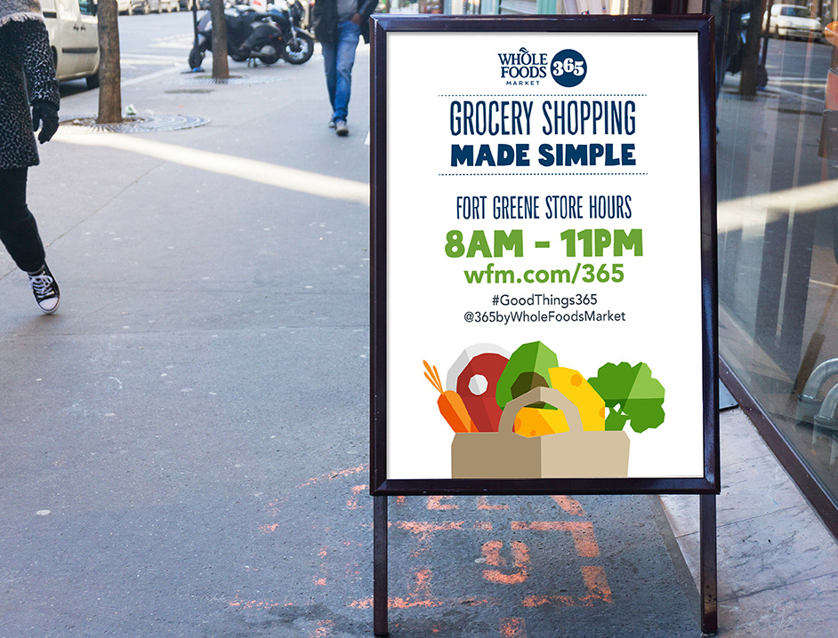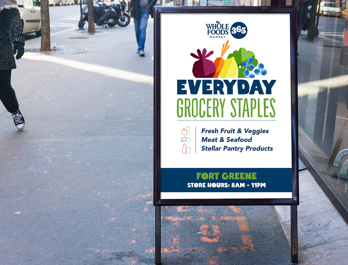 Overview | Designed a series of interchangeable A-frame posters for the 365 by Whole Foods Market store in Fort Greene, Brooklyn. These posters were created to highlight key store differentiators such as unique offerings, promotions, and brand values while aligning with 365’s visual identity. The flexible system allowed the store team to easily rotate signage based on messaging priorities, helping to attract foot traffic and engage the local community right at the storefront.